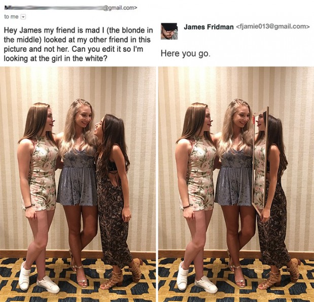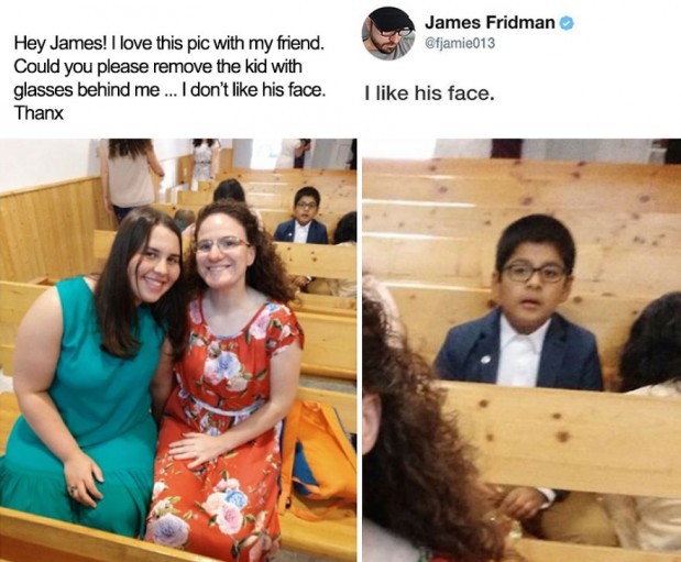 7. Hei James! Rakastan tätä ystäväni kanssa otettua yhteiskuvaa. Voisitko poistaa takana olevan silmälasipäisen lapsen, en pidä hänen kasvoistaan. Kiitos! – Minä pidän hänen kasvoistaan.