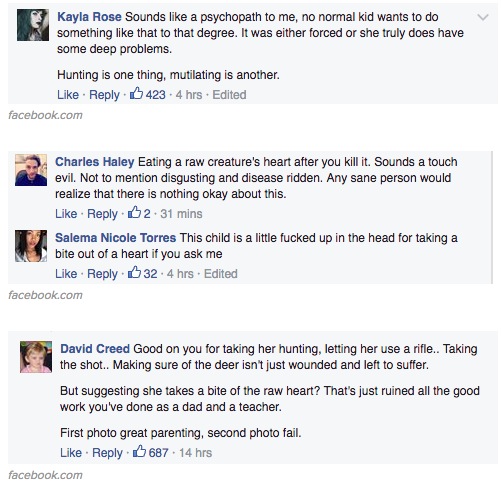 Kuva on jakanut mielipiteitä, sillä monien ihmisten mielestä on hienoa, että isä vie tyttärensä metsästämään ja näkemään, mistä liha on alunperin lähtöisin. Toiset ihmiset taas eivät voi käsittää isän toimintaa.