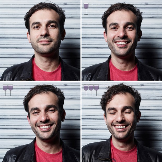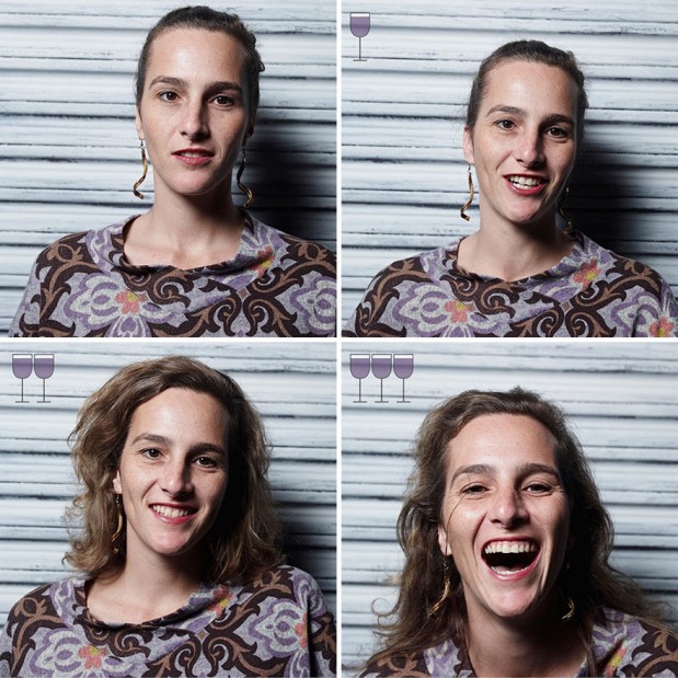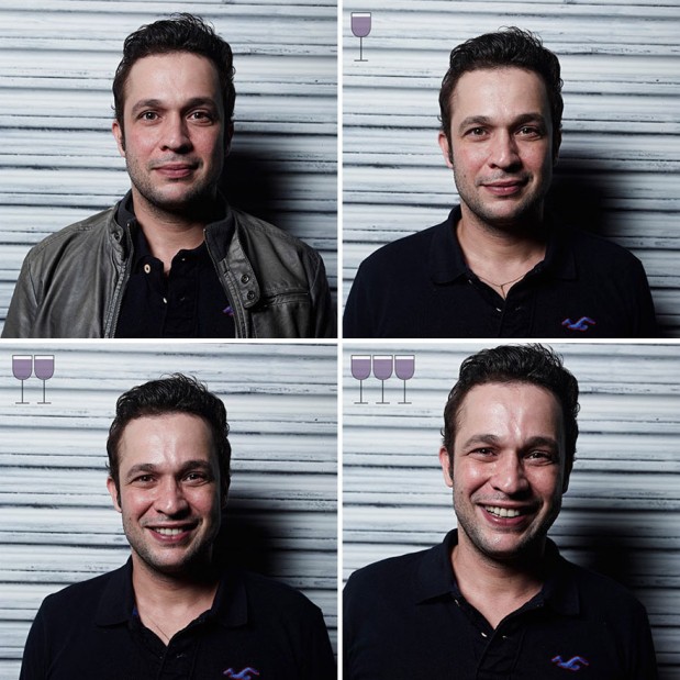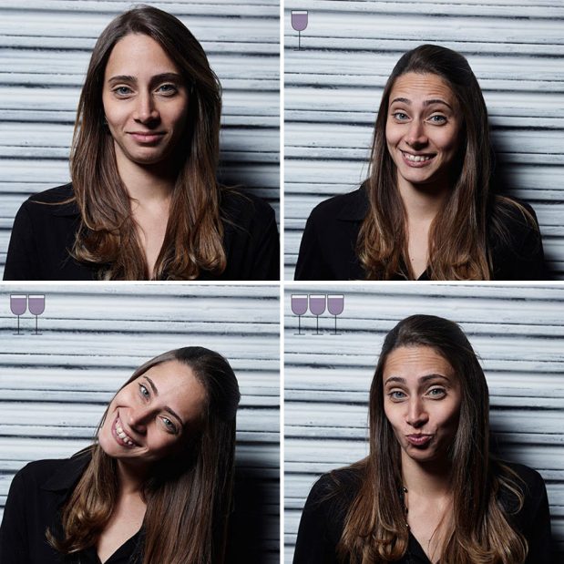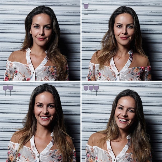 Marcos Alberti halusi nähdä, millaisia muutoksia alkoholi aiheuttaa ihmisten eleissä ja ilmeissä. Niimpä hän otti valokuvia yhden, kahden ja kolmen viinilasillisen nauttineista henkilöistä. Äkkiseltään voisi todeta ainakin sen, että sopiva määrä alkoholia sai kaikki ihmiset iloisemman ja rennomman näköisiksi. Kohtuus on kuitenkin aina hyvä muistaa kaikessa. Katso alta 20 kuvaa: