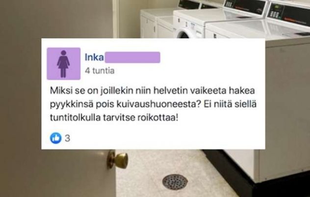 Inka suuttui huomatessaan pyykkien kuivaushuoneessa kuivia pyykkejä. Mitä? Siis aivan hirveää! Kuinka joku kehtaa pitää kuivia pyykkejä kuivaushuoneessa?! Inkan mukaan pyykit tulisi noutaa pois ennen kuin ne ovat kuivuneet kokonaan… En osaa sanoa miksi pyykkien kuivaushuone on siinä tapauksessa edes olemassa?