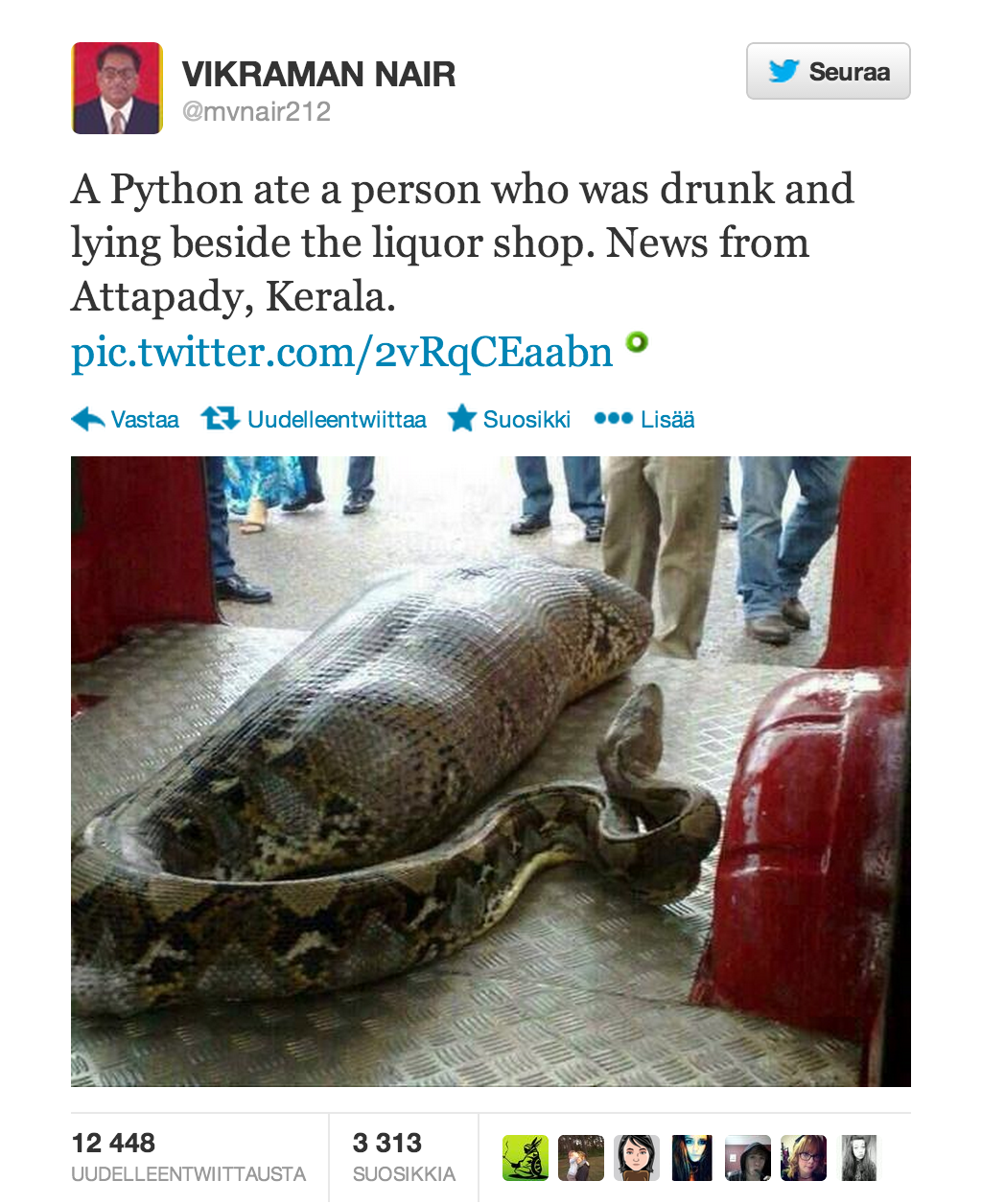Twitterissä leviää kuva pullistuneesta pyton-käärmeestä, joka on juuri nielaissut kadulle sammuneen miehen. Kuvan julkaissut Vikraman Nair kertoo twiitissään, että nielaistu mies makasi sammuneena viinakaupan edessä. Termi ”liskojen yö” sai juuri aivan uuden merkityksen.