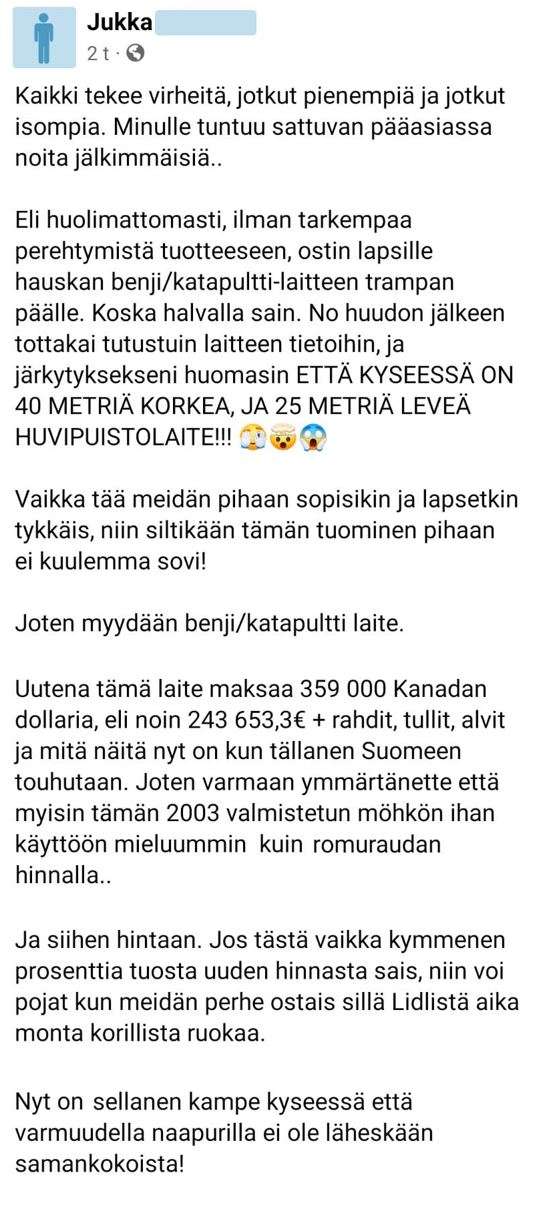 Jukka kertoi ostaneensa lapsille hauskan trampoliinin asennettavan benji- katapulttilaitteen. Jukka sai tuotteen poikkeuksellisen halvalla siksi hän teki ostoksen heti.