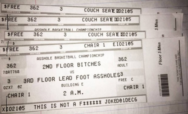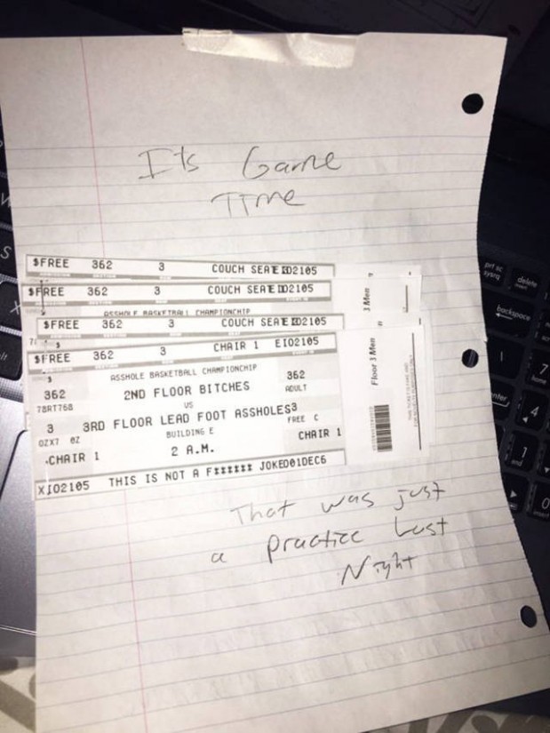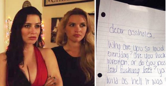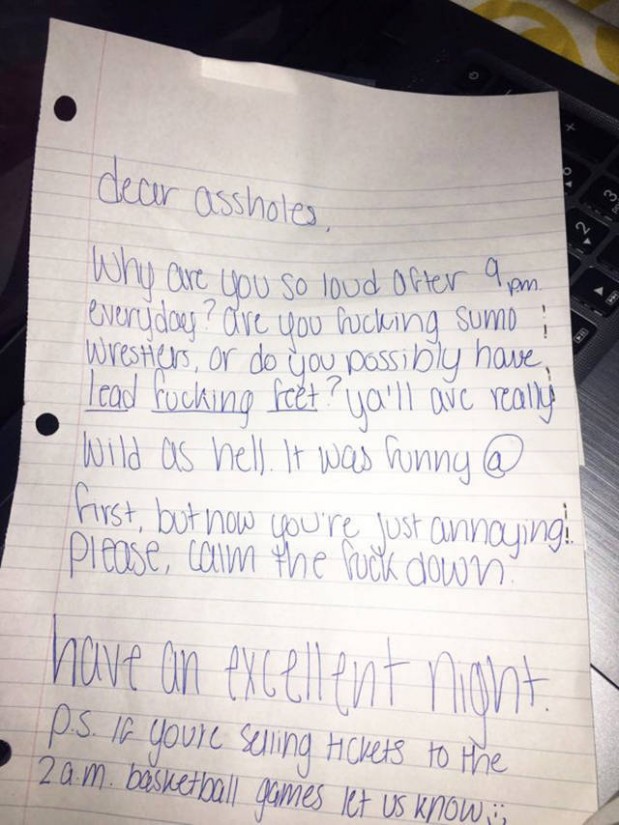”Rakkaat kusipäät. Miksi olette päivittäin niin äänekkäitä klo 21:00 jälkeen illalla? Oletteko jotain hiton sumopainijoita vai panetteko jaloillanne? Olette helvetin villejä ja aluksi se oli meidän mielestä huvittavaa, mutta nyt se on vain ärsyttävää. Rauhoittukaa vit*u nyt, jooko? Viettäkää erinomainen ilta! Ps. jos myytte lippuja baseball-otteluun, niin kertokaa siitä meille.”