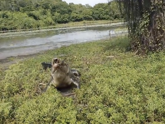 Daniel saa lopulta kalan kelattua rantaan, mutta suistokrokotiili ei suostu luovuttamaan mehukasta saalista kalastajille. Niinpä krokotiili syöksyy ulos joesta ja lähtee jahtaamaan kalaa, jota Daniel kelaa kohti itseään.