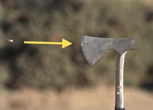 Katso mitä luodille tapahtuu, kun se osuu kirveen terään – halkeaako vai antaako kirven periksi?