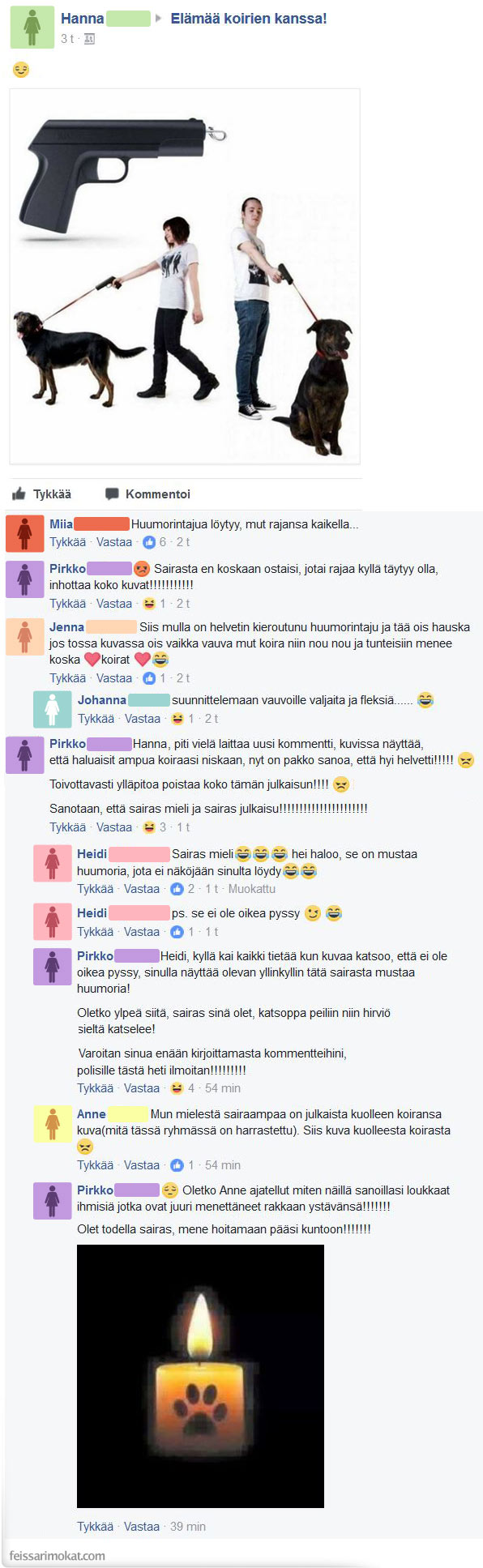 Feissarimokat: Koiraryhmissä mustaa huumoria — päivitys meni mauttomuuden puolelle