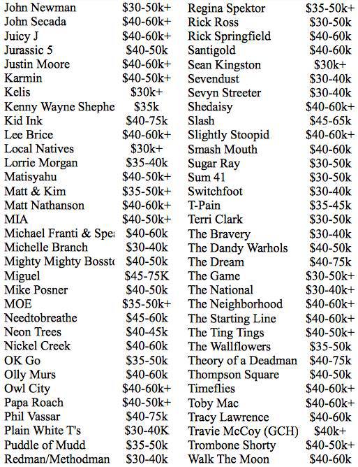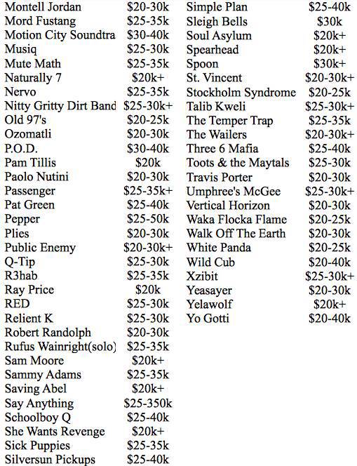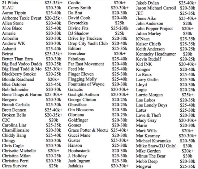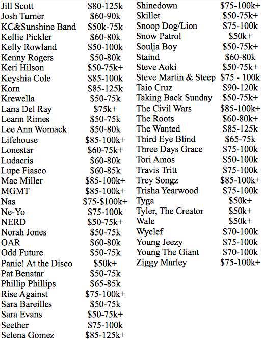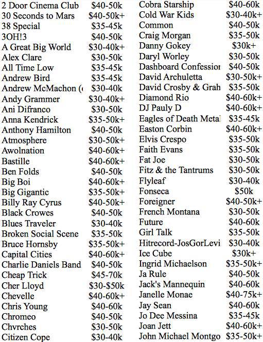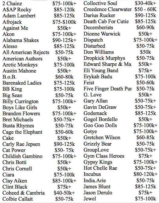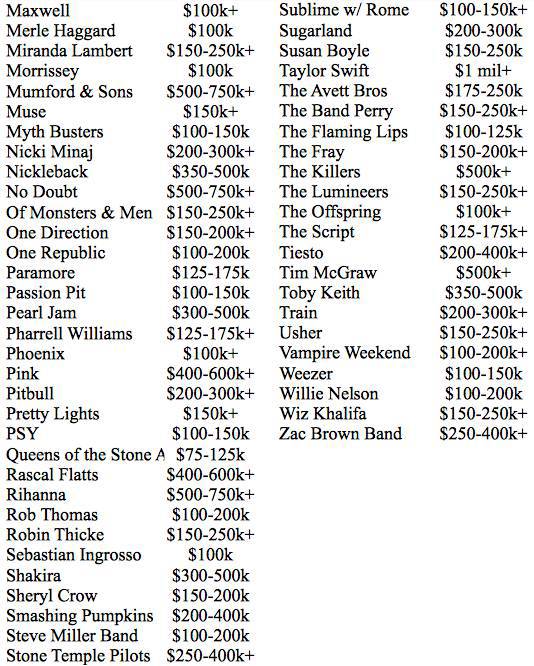 Moni on saattanut joskus miettiä, kuinka paljon maksaisi oman lempibändinsä tai artistinsa keikka omalla takapihalla. Keikka olisi varmasti ikimuistoinen ja sillä olisi varmasti arvoa myös median silmissä. Sanomattakin on selvää, että maailmanluokan bändien keikkapalkkiot ovat tähtitieteelliset, mutta kuinka paljon ne todellisuudessa maksavat? Seuraavalla listalla on useita bändejä ja artisteja sekä tietenkin heidän keikkapalkkionsa.