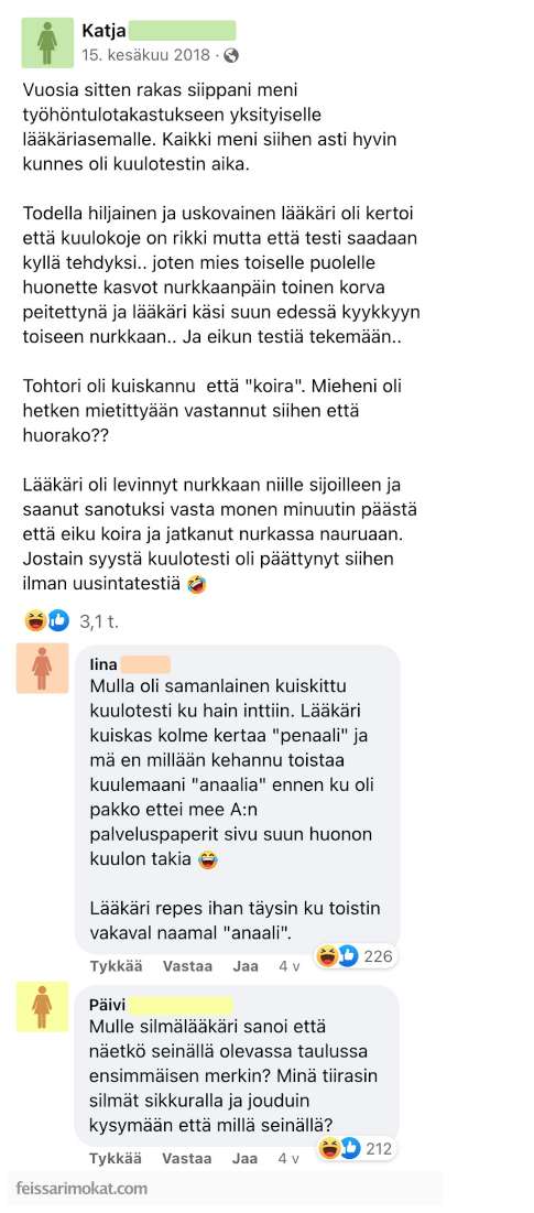 Lääkäri oli käyttänyt tähän aika vanhanaikaista menetelmää ja testi ei ollut sujunut ihan optimaalisella tavalla. Lääkäri oli nimittäin kuiskannut potilaalle ”koira” ja potilas oli kuullut ”huora”. Lääkäri ei pystynyt hallitsemaan koomista tilannetta ja sanomaan ”eikun koira”, ennen kuin oli nauranut useamman minuutin.