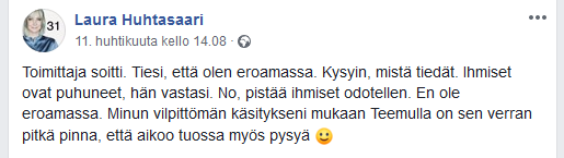 Näppärä toimittaja oli soittanut kansanedustaja Laura Huhtasaarelle ja tivannut, onko tämä eroamassa Teemu-aviomiehestään.