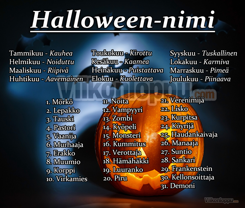 Yhdistä syntymäkuukautesi ja -päiväsi niin löydät oman halloween-nimesi. Minkä nimen sait? Mikä on kaverisi halloween-nimi?
