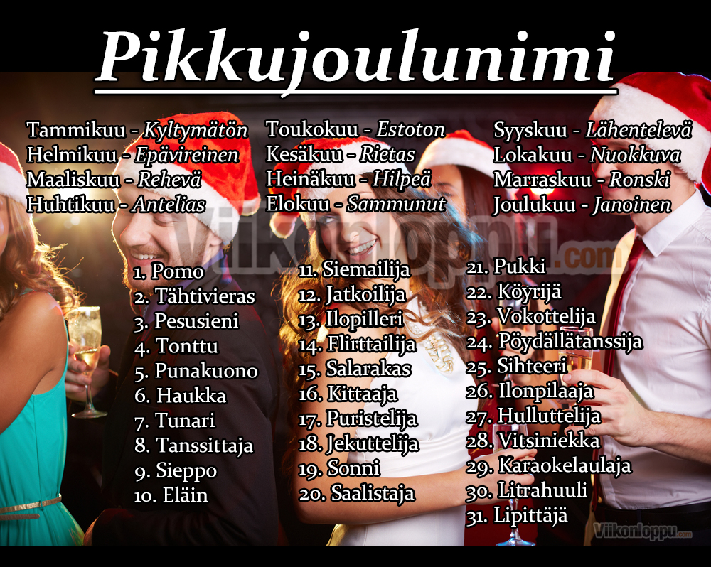 Yhdistä syntymäkuukautesi ja -päiväsi niin löydät oman pikkujoulunimesi. Minkä nimen sait? Mikä on kaverisi pikkujoulunimi?