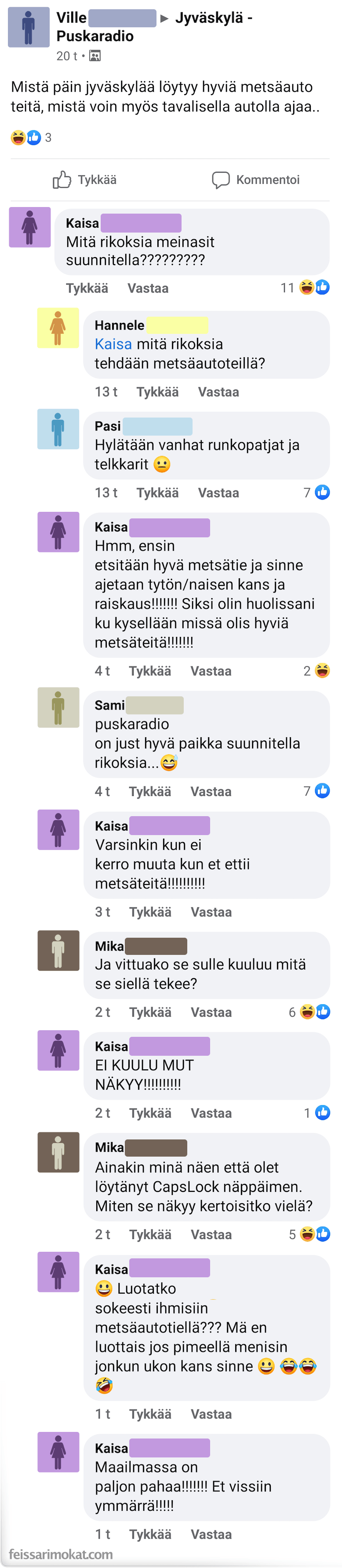 Jyväskylän Puskaradiossa nähtiin erään suomalaisnaisen mielestä ”epäilyttävä” julkaisu, jossa kysyttiin hyvien metsäautoteiden perään.