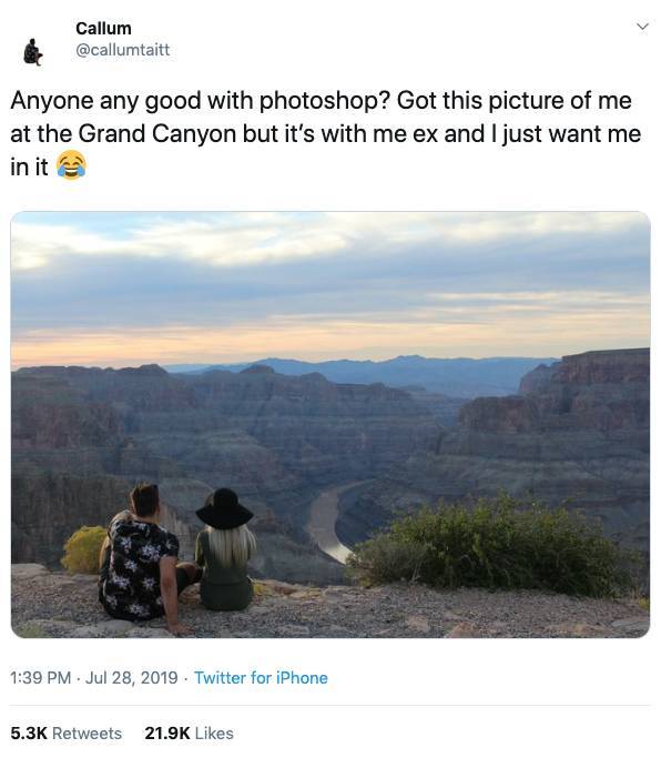Twitteriin ladattu kuva, jossa poikaystävä pyysi taitavia kuvanmuokkaajia poistamaan tyttöystävän, keräsi nopeasti huomiota. Syynä ei ollut se, että joku olisi poistanut tyttöystävän tyylikkäästi, vaan se että kuvasta tehtiin tolkuton määrä hullunkurisia versioita.