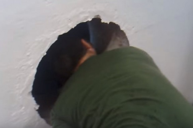Mies porasi seinään reiän ja huomasi sen takana olevan tyhjää tilaa. Hän päätti suurentaa reikää, kunnes siihen muodostui suuri aukko. Aukko johti erikoiseen huoneeseen, joka muistutti hieman vankityrmää.