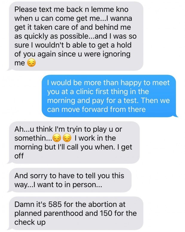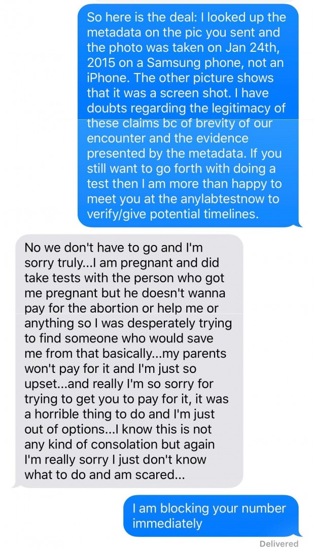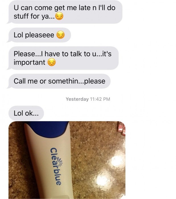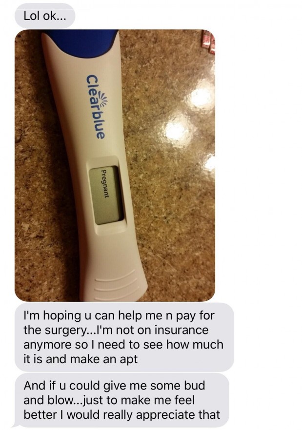 Mies oli harrastanut erään naisen kanssa yhden illan juttuja ja kaikki näytti olevan hyvin… Kaksikko oli harrastanut seksiä muutamaan otteeseen ja nainen yritti pyytää miestä luokseen useamman kerran. Mies ei kuitenkaan vaikuttanut kovin kiinnostuneelta, jonka seurauksena naispuolinen henkilö otti kovemmat otteet käyttöön. Hän lähetti miehelle kuvan, jossa oli kuva positiivisesta raskaustestistä. Mies haistoi koko tarinassa palaneen käryä, niinpä hän selvitellä kuvan alkuperää tarkemmin. Tarina sai todella erikoisen käänteen, kun nainen olikin tullut raskaaksi toiselle miehelle, joka ei halunnut maksaa aborttia. Niinpä nainen yritti saada aborttiin vaaditun summan mieheltä, joka ei ollut edes lapsen isä!#1