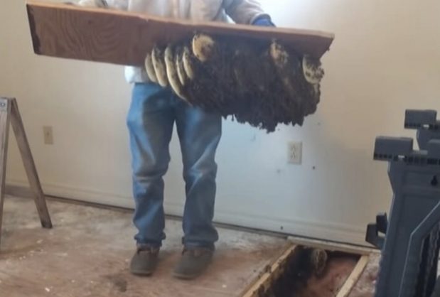 Naisen talossa oli aikaisemminkin pörrännyt mehiläisiä, mutta hän ei osannut odottaa että makuuhuoneen lattian alla odottaisi tällainen näky. Jeff löysi lattian alta nimittäin valtavan mehiläispesän.