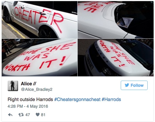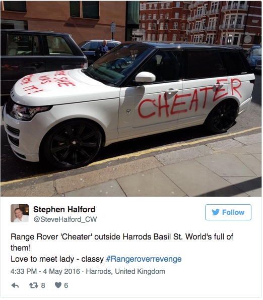 Pettäminen ei ole missään tilanteessa hyväksyttävää ja olisi reilua ja suoraselkäistä kertoa puolisolle, että haluaa erota ennen kuin hyppää toiseen sänkyyn. Pettämisestä kiinni jääneet henkilöt saavat onneksi usein kokea tilanteen kantapään kautta, kun vihaiset puolisot jättävät lopussa olevaan suhteeseen oman kädenjälkensä. Tällä kertaa uusi Range Rover sai kyytiä, kun vihainen puoliso piirsi tussilla ajoneuvoon muutaman viestin. Kadulla kävelleet ihmiset olivat huvittuneita ja napsivat ilmestyksestä Twitteriin kuvia.
