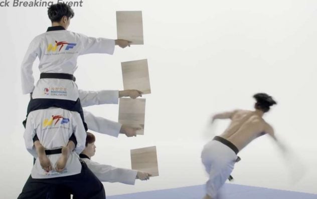 Pitkän harjoittelun aikana syntyvä tulos on hyvin havaittavissa tällä videolla, jossa nuori mies potkaisee 4 vanerilevyä yhden 720-asteen hypyn aikana. Mies siis käytännössä ponnistaa ilmaan pyörien kaksi kertaa oman akselinsa ympäri ja potkii samalla vanerilevyt halki.