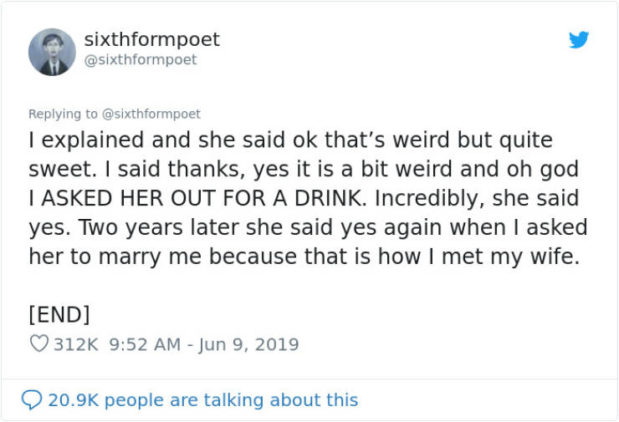 ”Selitin tilanteen ja hän sanoi että se oli outoa mutta melko suloista. Sanoin kiitos, se on vähän outoa ja voi luoja MINÄ PYYSIN HÄNEt DRINKILLE KANSSANI. Ja kuin ihmeen kaupalla, hän sanoi kyllä. Kaksi vuotta myöhemmin, hän sanoi toisen kerran kyllä, kun kosin häntä. Näin minä tapasin vaimoni. LOPPU.”
