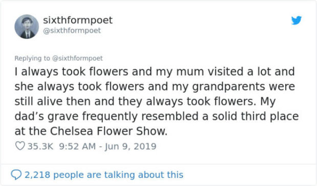Sixthformpoet kertoo vieneensä isänsä haudalle, joka jopa palkittiin paikallisessa kukkakilpailussa.