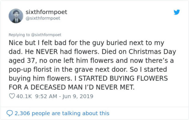 Isän haudan vieressä oli kuitenkin mies, jonka haudalla ei ollut koskaan kukkia. Hän oli kuollut joulupäivänä vain 37-vuotiaana ja kukaan ei vienyt hänen haudalleen kukkia. Niinpä mies päätti alkaa ostaa kukkia myös tuntemattoman miehen haudalle.