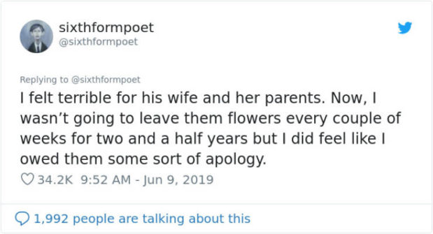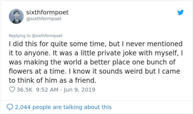 ”Kyseessä oli minun henkilökohtainen juttuni, tein maailmasta parempaa paikkaa yksi kukkakimppu kerrallaan. Tiedän että tämä kuulostaa oudolta, mutta pidin häntä ystävänäni.”