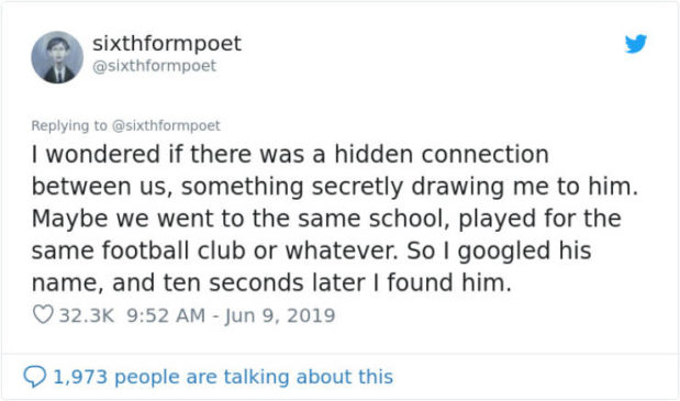 ”Aloin kuvitella että välillämme on salainen yhteys, jokin veti minua hänen puoleensa. Ehkä me kävimme samaa koulua, pelasimme samassa jalkapallojoukkueessa tai mitä tahansa. Joten googlasin hänen nimensä ja osuma löytyi 10 sekunnissa.”