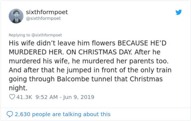 ”Vaimo ei jättänyt hänelle kukkia, sillä MIES OLI MURHANNUT HÄNET. JOULUPÄIVÄNÄ. Kun hän oli murhannut vaimonsa, hän murhasi myös vanhempansa. Tämän jälkeen hän hyppäsi itse junan alle.”