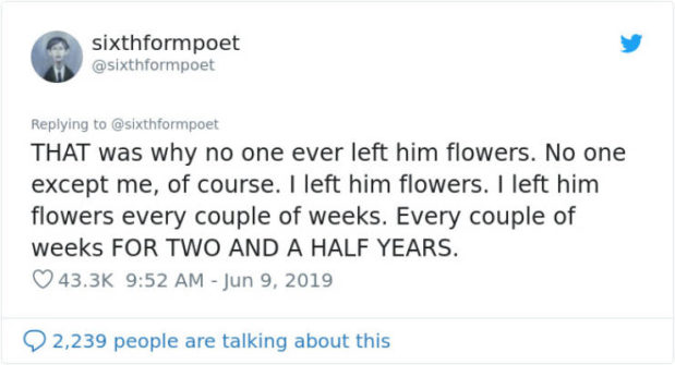 ”JA TÄMÄN VUOKSI kukaan ei vienyt hänelle kukkia. Ei kukaan muu paitsi minä, tietenkin. Minä jätin hänelle kukkia. Minä jätin hänelle kukkia joka toinen viikko. Joka toinen viikko KAHDEN JA PUOLEN VUODEN AJAN.””