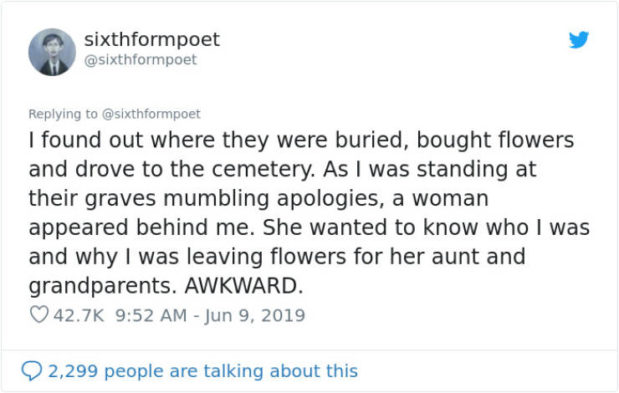 ”Selvitin minne vaimo ja vanhemmat oltiin haudattu, ostin kukkia ja ajoin heidän hautausmaalleen. Seisoin heidän hautansa edessä pyytäen anteeksi samalla, kun tuntematon nainen ilmestyi taakseni. Hän halusi tietää kjuka minä olin ja miksi jätin kukkia hänen tädilleen ja isovanhemmilleen. NOLOA.”