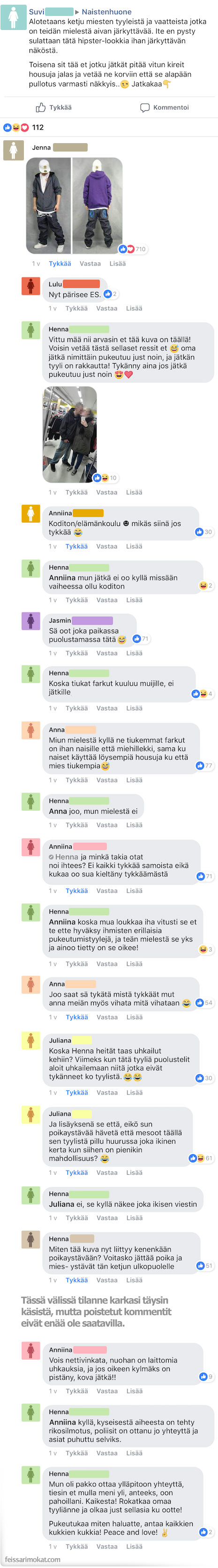 Suosittelen katsomaan, millaisista asukokonaisuuksista suomalaisnaiset eivät pidä ainakin siinä tapauksessa jos olet sinkku. Suvi aloitti keskustelun ja totesi että liian tiukalle vedetyt housut ja hipster-look ei iske häneen millään tavalla. Ehkä osaat jo arvata että tällainen keskustelu voi mennä joillakin henkilöillä tunteisiin… Poliisitkin pääsivät mukaan kuvioihin, kun naiset alkoivat uhkailla toisiaan ja kertoivat pistävänsä jengiä kylmäksi. Tätä keskustelua lukiessa ei voi muuta kuin nauraa.