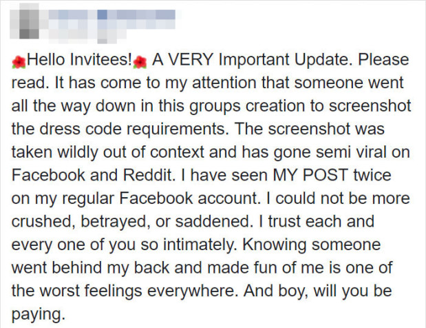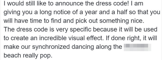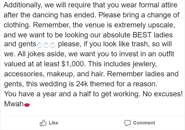 Morsiamen kuuluu olla juhlien keskipisteenä, mutta… Tämä ei tarkoita sitä että hänen tulee päättää kirjaimellisesti kaikesta. Internetissä leviää tällä hetkellä huvittavia kuvankaappauksia morsiamesta, joka antoi tarkat ohjeet siitä, kuinka vieraiden tulisi pukeutua.