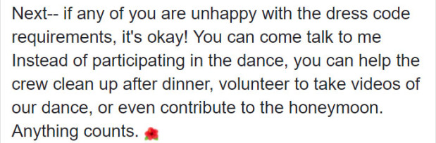 Voit lukea morsiamen laatiman pukukoodin alapuolelta.
