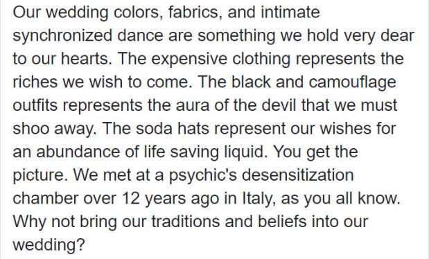 Olisin jättänyt tällaiset häät välistä. :D Morsian voisi nauttia juhlasta yksin ”tarkasti suunnitellun pukukoodin kanssa.”