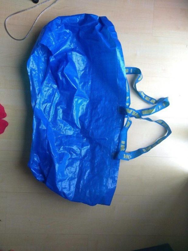 IKEA:n muovipussin pohjaan leikataan jalkojen mentävä reikä, jonka jälkeen