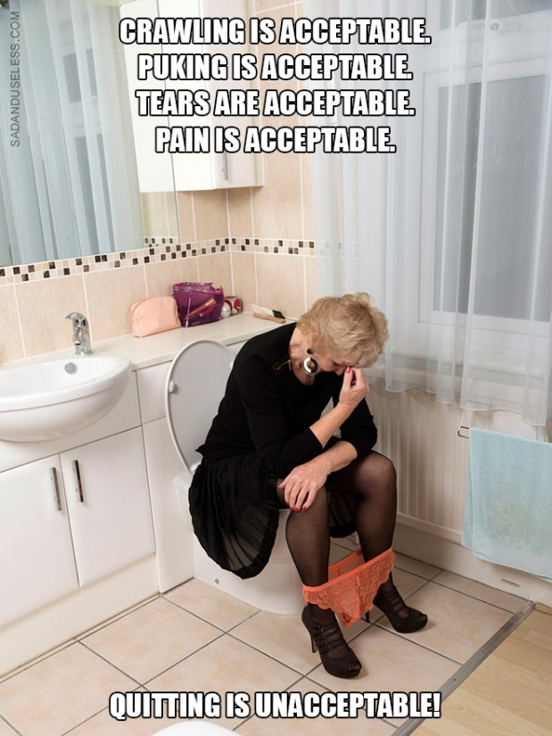 #9 ”Konttaaminen on hyväksyttävää. Oksentaminen on hyväksyttävää. Kyyneleet ovat hyväksyttävää. Kipu on hyväksyttävää. Lopettaminen ei ole hyväksyttävää.”