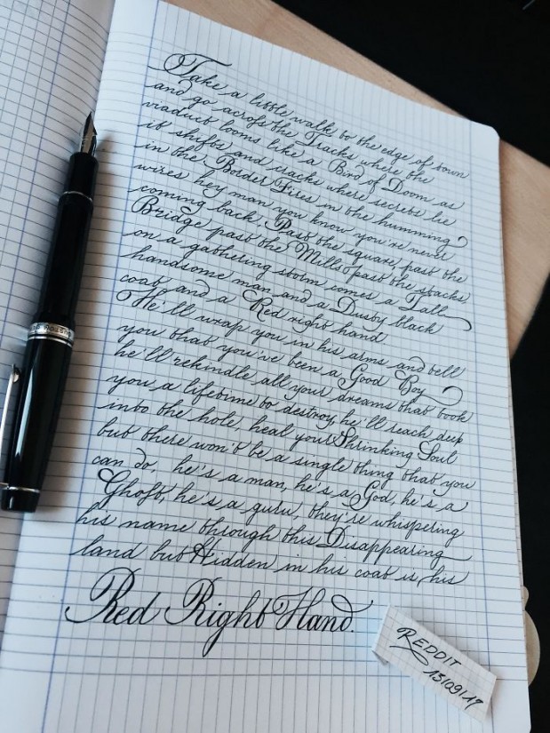 Kirjoitin käsin viimeksi koulussa, jonka jälkeen olen näpytellyt jo useita vuosia tietokoneella. Tämän seurauksena käsialastani on tullut niin rumaa, etten meinaa kehtaa kirjoittaa paperille edes omaa nimmaria – en tiedä pystytkö samaistumaan? Joka tapauksessa on todella hienoa nähdä että jotkin ihmiset osaavat vielä kirjoittaa todella kauniisti ja ennen kaikkea tarkasti. Moni pärjäisi varmasti paremmin koulussa, kun muistiinpanot olisi tehty näin kauniilla käsialalla!Löydät kuvat alapuolelta!