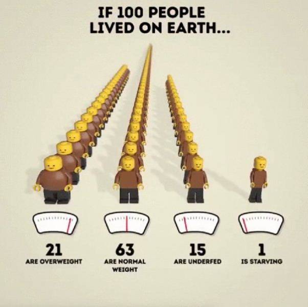 #16 Maailmassa olisi 21 ylipainoista, 63 normaali painoista, 15 alipainoista ja 1, joka näkisi nälkää.