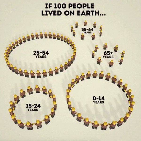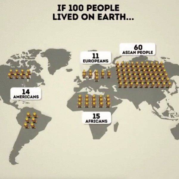 Voit katsoa oheisista kuvista, miltä maailma näyttäisi jos vain 100 ihmistä asuisi täällä.