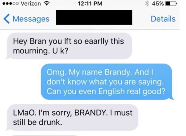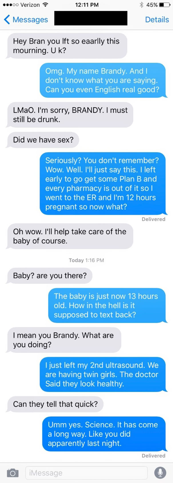 Brandy jakelee väärää puhelinnumeroa miehille, jotka tulevat iskemään häntä baarissa. Väärän numeron omistaa toinen mies, joka hoitaa keskustelun huvittavilla tavoilla.Katso tekstiviestit alapuolelta: