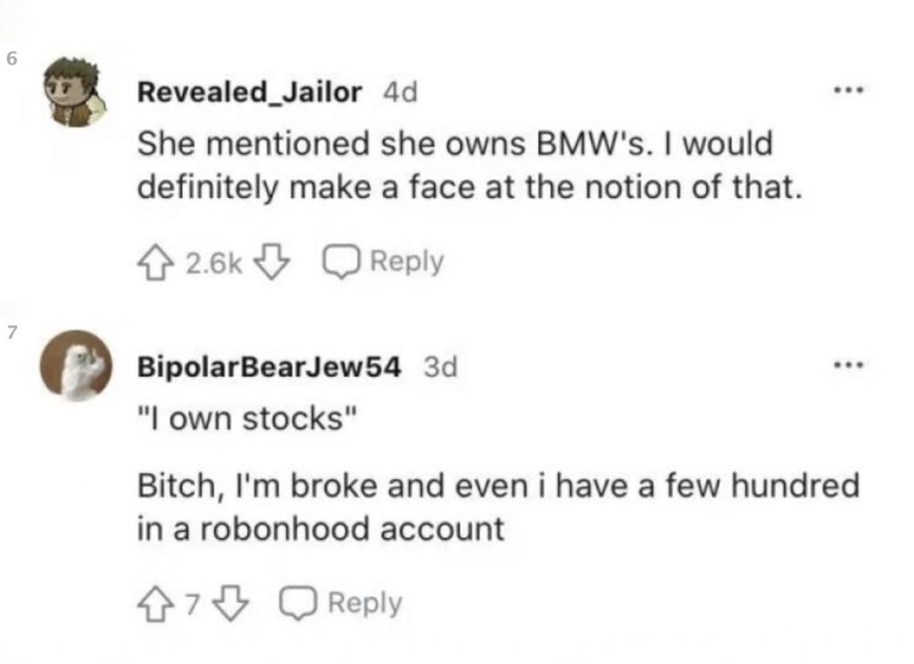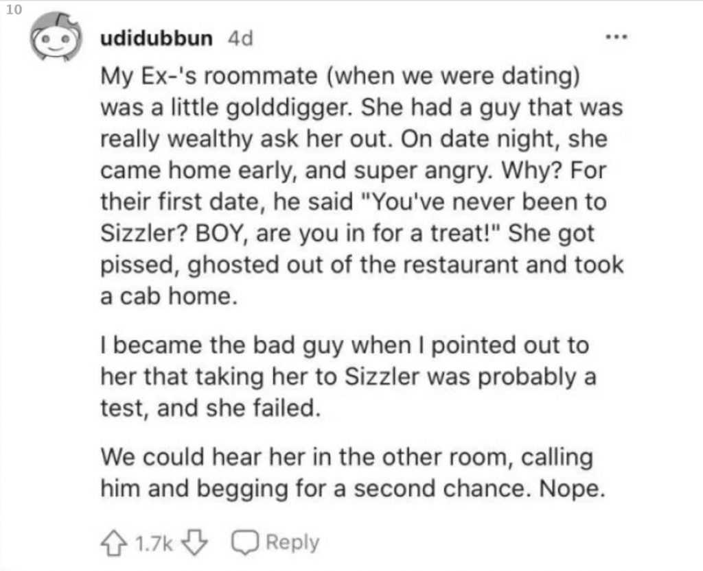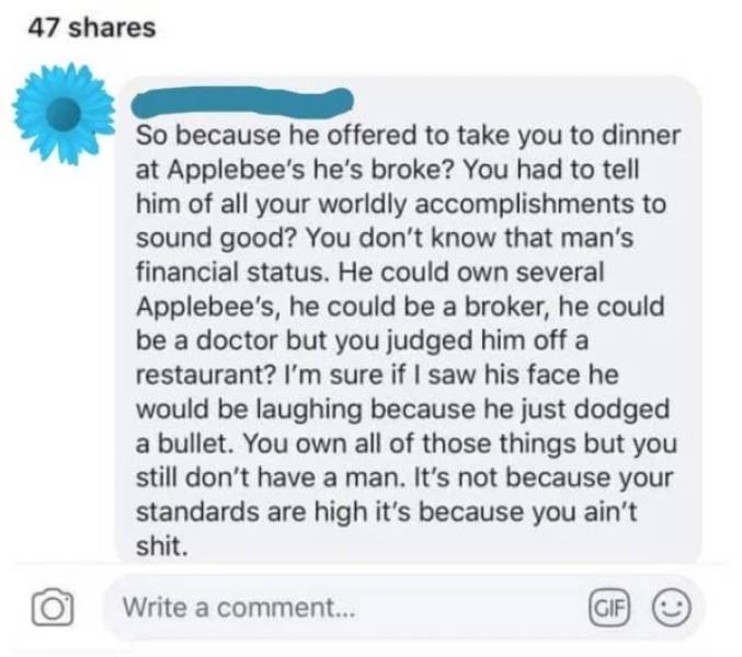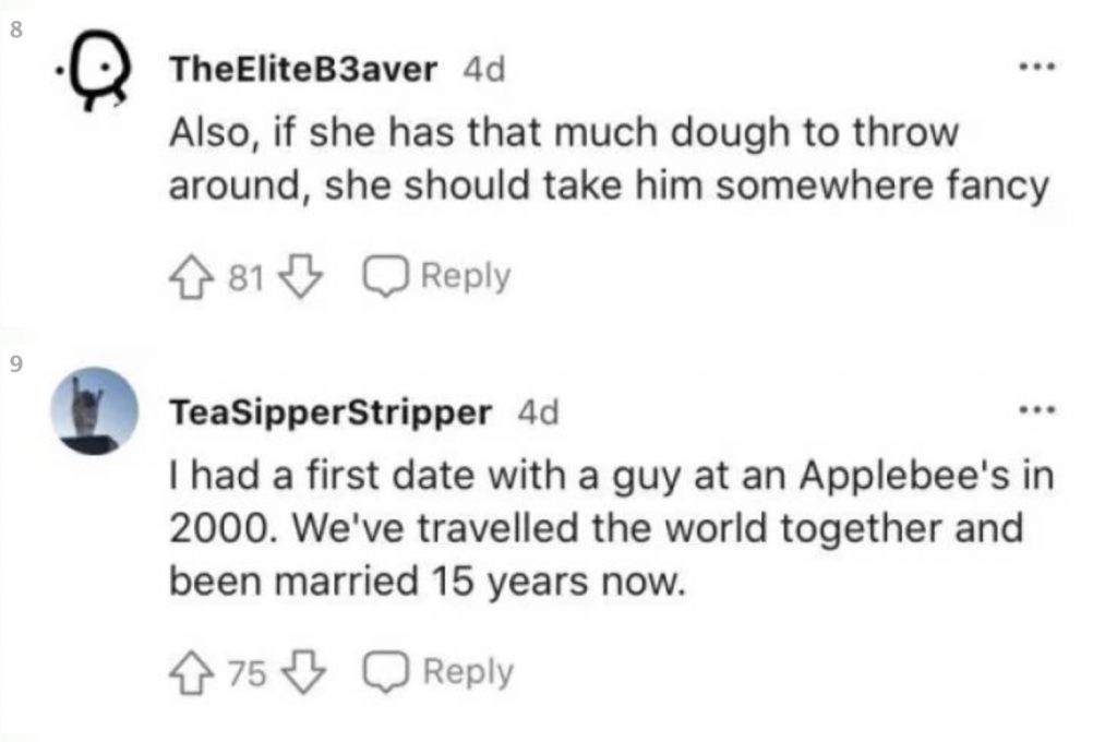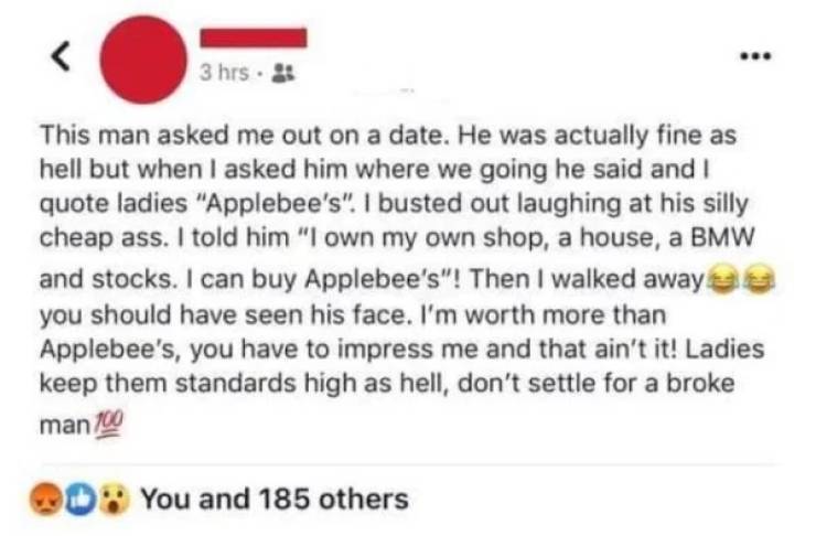 Kaikki alkoi siitä, kun nenäkäs nainen kertoi hylänneensä miehen treffipyynnön sen jälkeen, kun hän ehdotti treffipaikaksi Applebee’s -pikaruokaketjun ravintolaa. Nainen kertoi olevansa rikas, omistavansa liikkeen, talon, BMW:n ja osakkeita. Hän totesi myös voivansa halutessaan ostaa koko Applebeen.