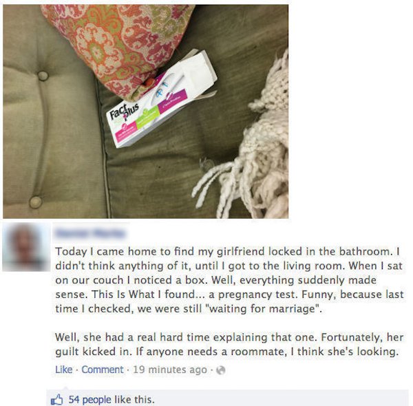 5. Jonkin ajan kuluttua poikaystävä löysi kuitenkin tyttöystävänsä sohvalta raskaustestin, jonka harva ostaa vain huvinvuoksi. Tyttöystävä yritti selitellä tilannetta, mutta murtui lopulta ja tunnusti kaiken.
