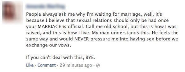 1. ”Ihmiset aina kysyvät, miksi en harrasta seksiä ennen avioliittoa. Se johtuu siitä, että seksuaalista kanssakäymistä tulisi harrastaa vasta, kun on avioliitossa. Voitte kutsua minua vanhanaikaisesksi, mutta sellainen minä vain olen”