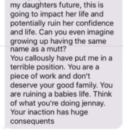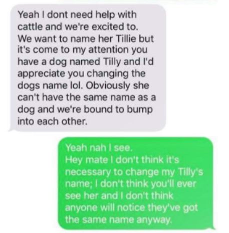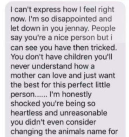 Naapuri pyysi Jennayta vaihtamaan koiransa nimen toiseen nimeen, koska uuden lapsen nimi tulisi olemaan sama kuin koiran nimi. Mielestäni vaatimus on kohtuuton, sillä pienelle tyttölapselle voisi ihan hyvin antaa toisen nimen.