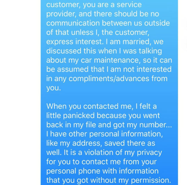Naimisissa oleva nainen sai loistavan tilaisuuden antaa autokorjaajalle opetuksen, jonka hän tulisi muistamaan vielä pitkään. Nainen lähetti tekstiviestin, jossa hän kertoi miksi autokorjaajan lähettämä viesti oli epäasiallinen ja että hän voisi tehdä tapauksesta valituksen.