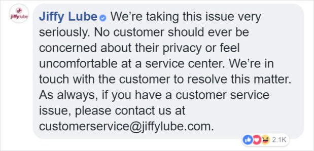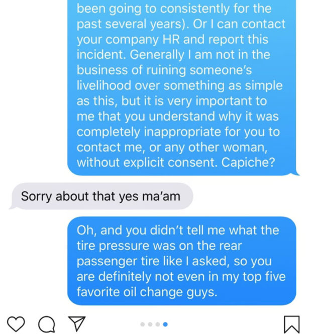 Eräs Twitter-käyttäjä julkaisi tarinan, joka osoittaa kuinka tärkeää seksuaaliseen häirintään on puuttua. Tapaus sattui Jiffy Lube -nimisellä autokorjaamolla, jossa auton öljyt vaihtanut mies selvitti naisen puhelinnumeron ja lähetti hänelle epäasiallisen tekstiviestin.