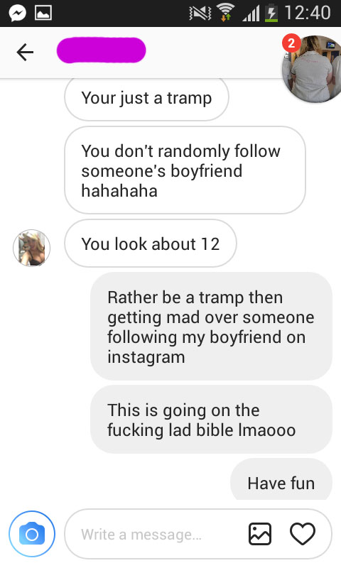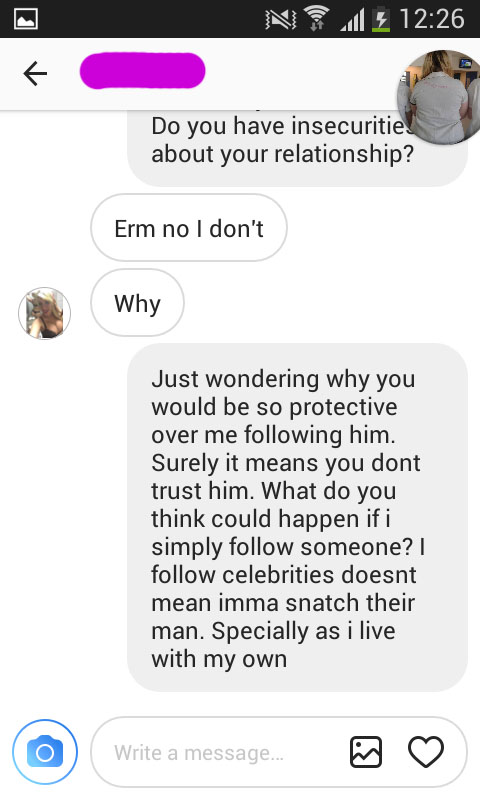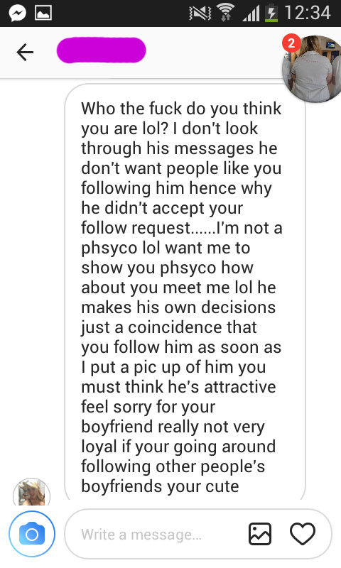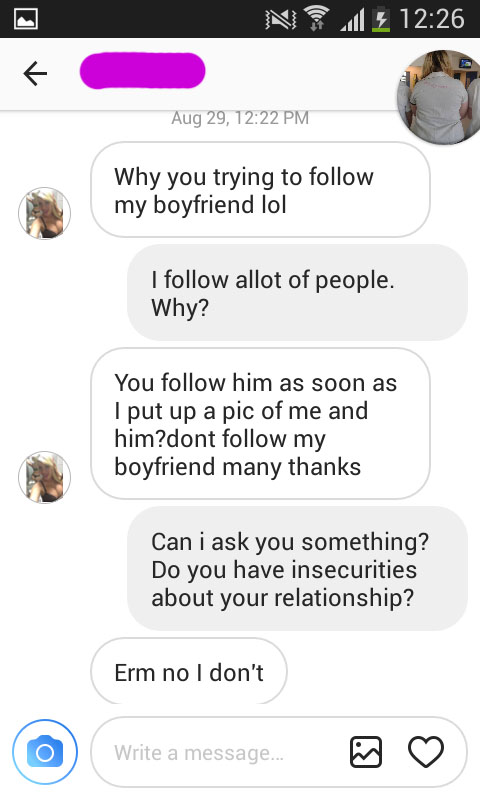 Sosiaalinen media on varmasti aiheuttanut lukuisia eroja, kun pariskunnat ovat ajatuneet riitoihin muutaman tykkäyksen tai kommentin johdosta. Tässä tapauksessa näemme todella mustasukkaisen tyttöystävän — syynä oli se, että tuntematon nainen oli alkanut seurata mustasukkaisen tyttöystävän poikaystävää Instagramissa. Tällaisessa tapauksessa on ehkä paras sulkeutua kokonaan somen ulkopuolelle, jotta mieli pysyy kasassa. Voit alapuolelta lukea jäätävän tilityksen, joka kehkeytyi suureksi sanaharkaksi.1.