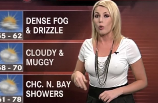 Kiusallinen tilanne sattui suoran lähetyksen aikana. Osaatko arvata, mistä oli kysymys? Alla oleva kuva antaa pienen vihjeen siitä mitä tapahtui, kun Jacqueline alkoi puhumaan kylmästä säärintamasta. Jacquelinen nännit päättivät toimia omien vaistojensa varassa, kun ne nousivat pystyyn lähetyksen aikana. Meteorologi ei ollut ilmeisesti tietoinen siitä, mitä hänen päänsä alapuolella tapahtui. Nanni1 Voit katsoa oheiselta videolta, miltä tilanne näytti suoran lähetyksen aikana. Kiinnitä huomiota ääniefektiin, jonka jälkeen alkaa tapahtua!