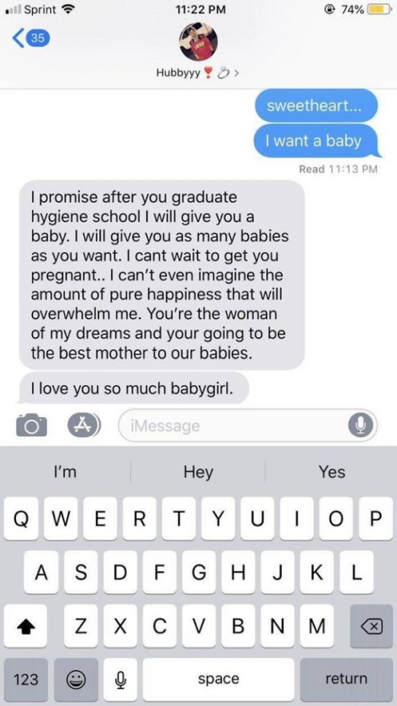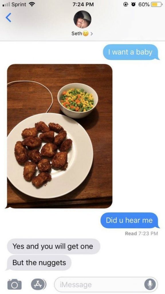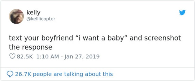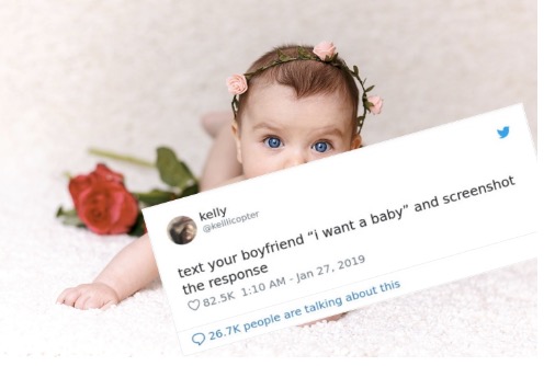 Twitter-käyttäjä @kellicopter aloitti keskustelun, jossa naisten tehtävänä oli laittaa poikaystävälle viestiä ja kertoa että he haluavat vauvan. Tämän jälkeen he ottivat kuvakaappauksen vastauksesta ja julkaisivat sen Twitter-keskusteluun.