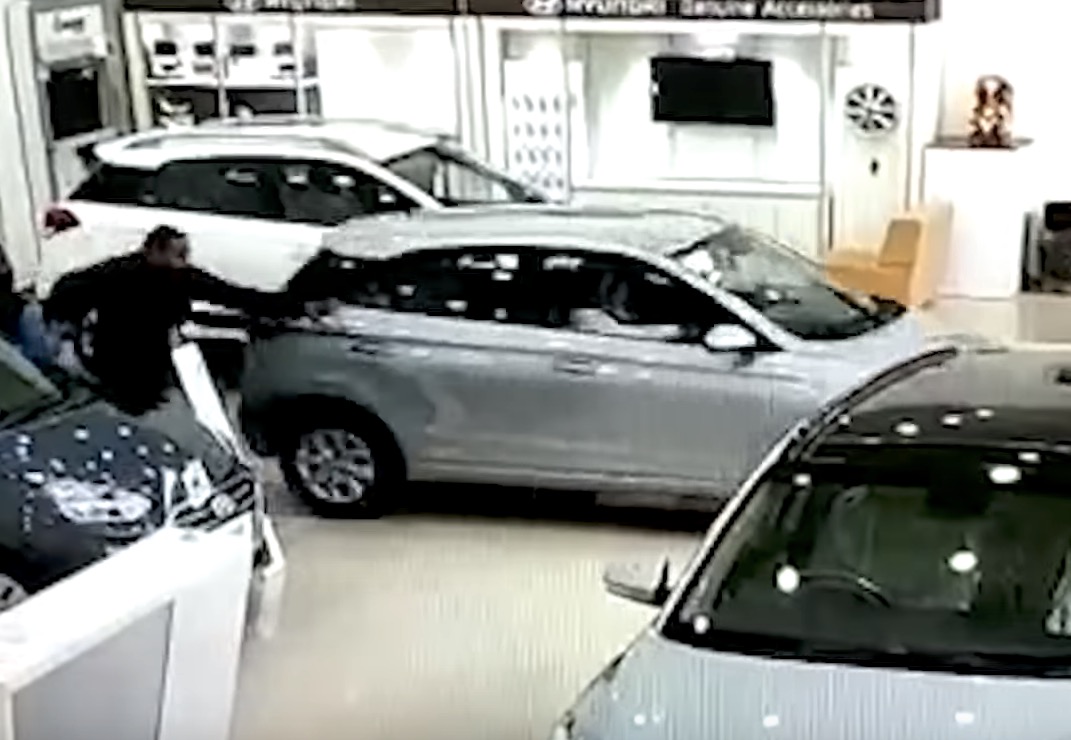 Nuori nainen oli Hyundain liikkeessä ostamassa autoa yhdessä vanhempiensa kanssa. Myyjä oli pyytänyt naista istahtamaan liikkeessä olevan auton sisälle – virhe sattui, samalla hetkellä, kun nainen istui ja painoi vahingossa kaasupolkimen pohjaan. Paniikissa ollut nuori nainen painoi vain lisää kaasua, yrittäessään tavoitella jarrua. Tämän seurauksena auto lensi autoliikkeen näyteikkunasta ja törmäsi myös muihin liikkeen omistamiin autoihin. Onneksi kukaan ei kuitenkaan loukkaantunut ja tämän vuoksi uskallan sanoa että tilanne oli kyllä aika koominen. :DLUE MYÖS:
